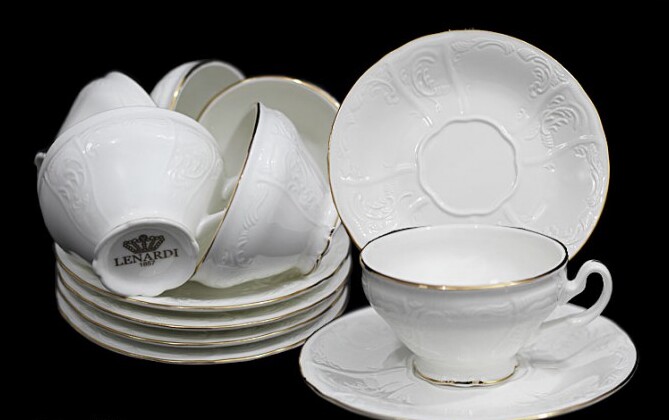 Cet ensemble est "l'idée originale" de la société de fabrication chinoise "Lenardi". Les produits de cette marque sont particulièrement reconnaissables sur les marchés russes. Ils se distinguent par leur mélodie unique, leur composition à paroi mince et leur blancheur. Il convient également de noter le moindre coût des marchandises par rapport aux marques précédentes. Mais cela dépend aussi de la qualité des matières premières (le degré de présence d'argile blanche dans la masse brute), à partir desquelles les produits sont fabriqués. Tous les couverts Lenardi sont exquis et uniques. Ils deviendront véritablement une parure de toute table de fête et satisferont les exigences les plus strictes des connaisseurs d'ustensiles à thé.