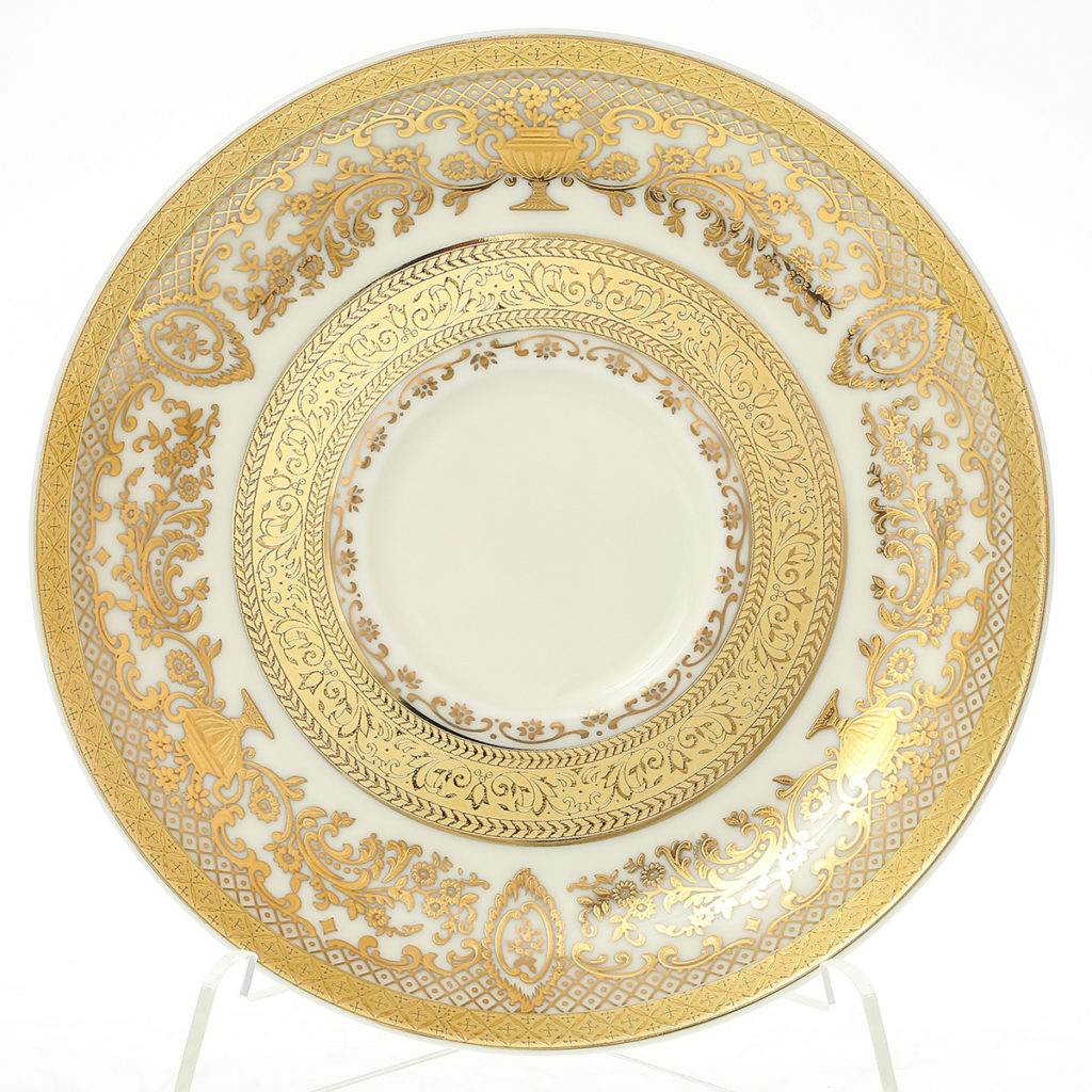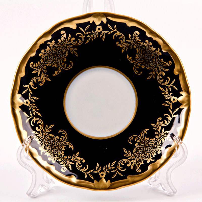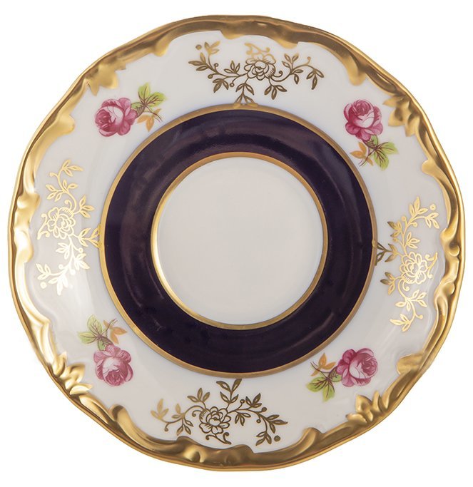 L'ensemble "Anna Amalia" est conçu pour 6 personnes et se compose de soucoupes rondes d'un diamètre de 150 mm, décorées sur le pourtour de fleurs dorées décoratives.