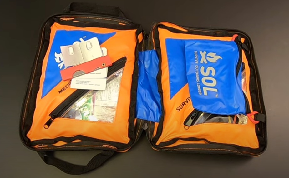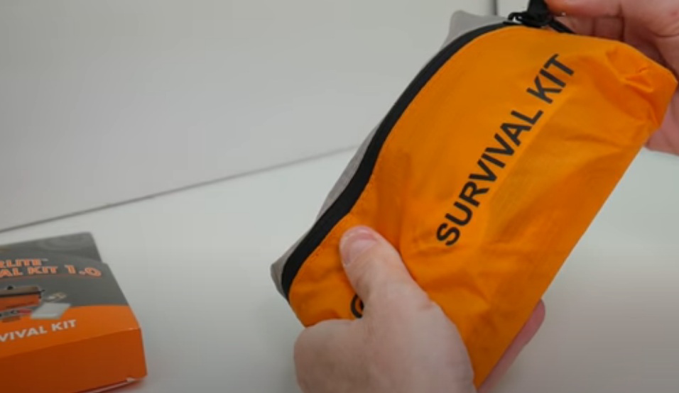 Le kit de survie est logé dans une pochette en nylon zippée avec des poignées en caoutchouc à l'intérieur.