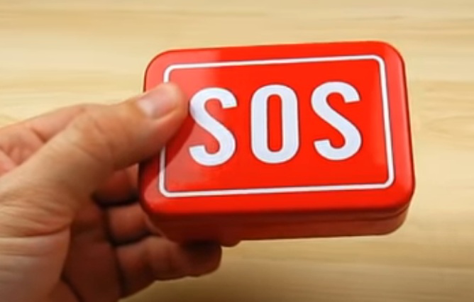 Une petite boîte en métal avec un bon ensemble d'équipements de survie nécessaires d'un montant de 6 pièces.
