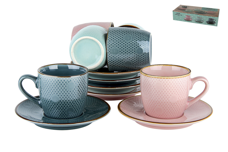 Taille de la tasse - 160 ml, le fond est étroit - convient pour l'espresso et le cappuccino. L'ensemble contient 2 éléments : une soucoupe mesurant 13 cm et une tasse avec une hauteur et un diamètre de l'extrémité supérieure de 7,5 mm.