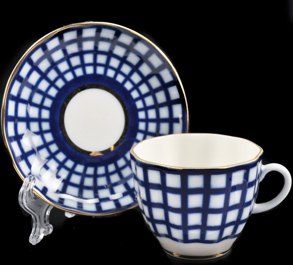 La forme de la tasse ressemble à une tulipe. La porcelaine dure blanche comme neige est peinte en carreaux de couleur cobalt, en tenant compte d'une légère vague sur la tasse. L'illusion de vagues profondes à la surface est créée.