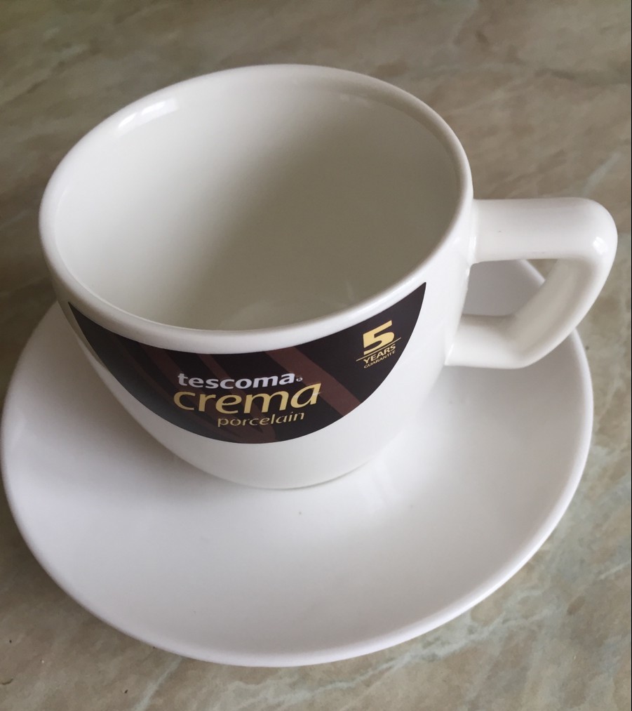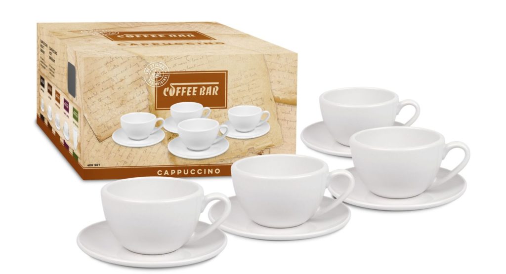 Une autre nouveauté. Les fabricants allemands ont également pris soin des amateurs de latte. Un ensemble de tasses classiques en porcelaine blanche. Sur le côté de la tasse se trouve un dessin en forme de cachet de cire avec l'inscription "café". Sur la soucoupe - éclaboussures occasionnelles de boisson et de céréales.