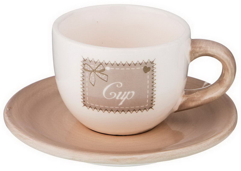 Le bonnet est blanc avec un motif imprimé sur le côté. Une soucoupe et une anse couleur café au lait soulignent le but de la vaisselle.