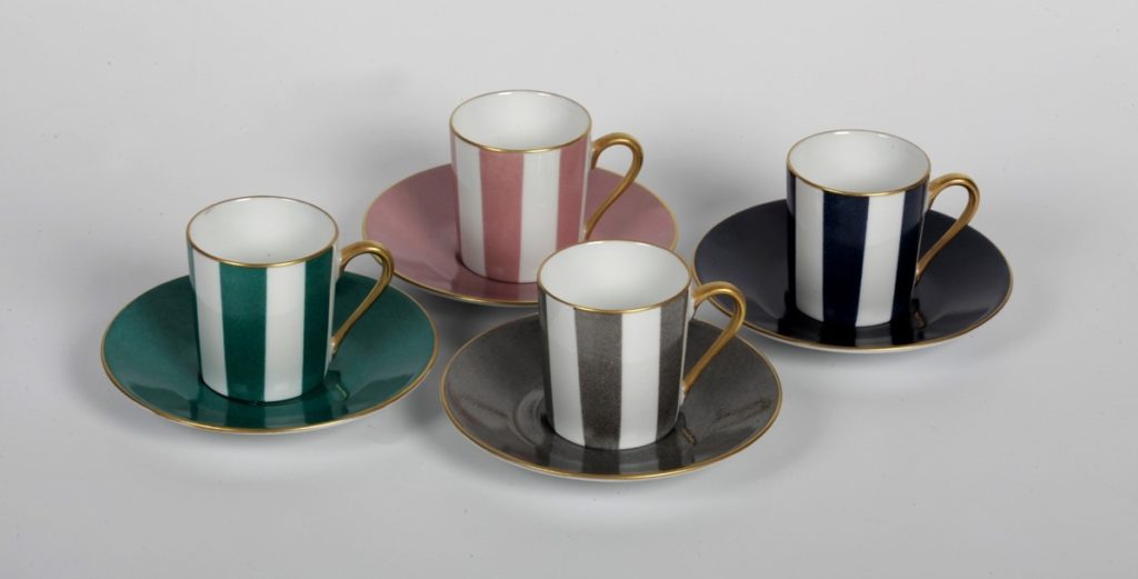 Sur une tasse en porcelaine, des rayures turquoises strictes confèrent au produit légèreté et espièglerie. Les lacunes blanches semblent s'enfoncer dans une soucoupe verdâtre. Des dorures sur les tranches et sur le manche rendent la paire élégante.