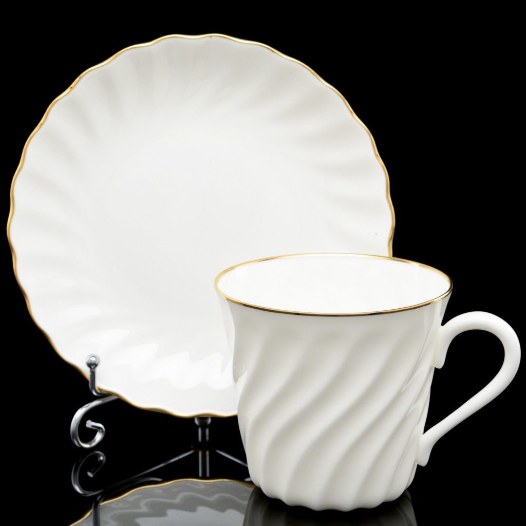Le fond de la tasse et toute la soucoupe sont recouverts d'un motif en maille complexe avec des nœuds dorés et de la dentelle. Le dessus est texturé, comme des pétales blancs comme neige. Dans le même temps, une paire de porcelaine peut être chargée dans le lave-vaisselle et nettoyée de la plaque par n'importe quel moyen.