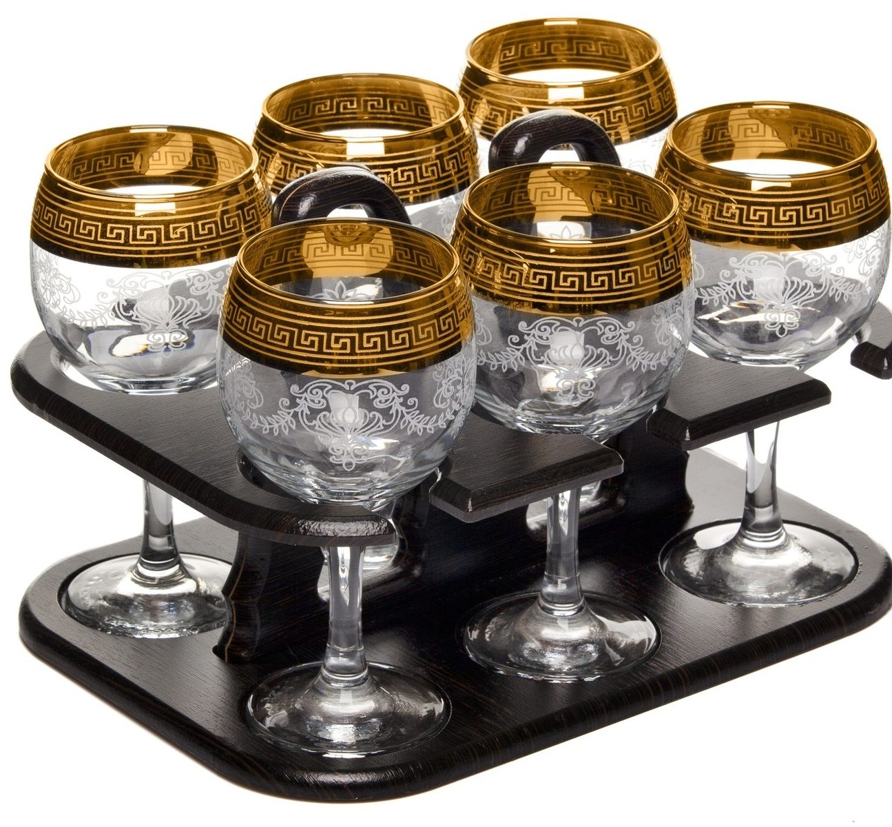 L'ensemble Harmony de fabrication russe est en verre et se compose de 6 verres d'une capacité de 60 ml chacun et d'un support. Les récipients sont en verre et décorés d'un motif, le support est en bois sculpté. Un ensemble élégant, pratique et de haute qualité sera un merveilleux cadeau et décoration pour n'importe quelle table.