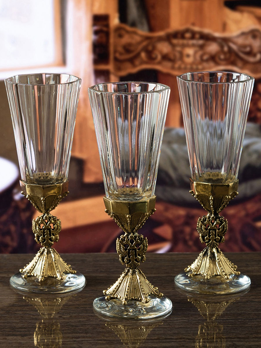 Un bel ensemble, idéal comme cadeau, est fait de cristal de haute qualité. Les pieds décoratifs sont fabriqués en laiton à la main et ont une forme bizarre qui tient parfaitement dans la main. Il n'y a que 3 verres dans l'ensemble, emballés dans une boîte cadeau avec un insert. L'apparence des produits est inhabituelle, grâce à quoi ils seront un excellent cadeau pour les hommes et les femmes.