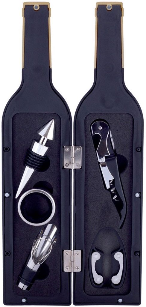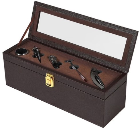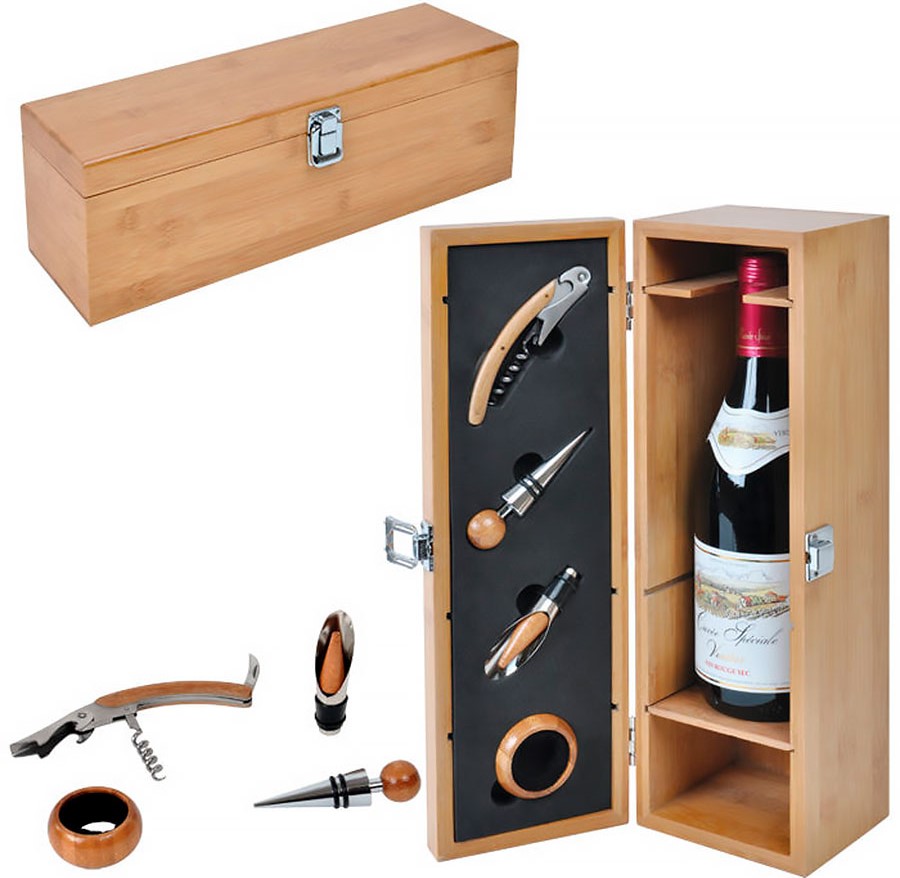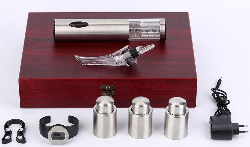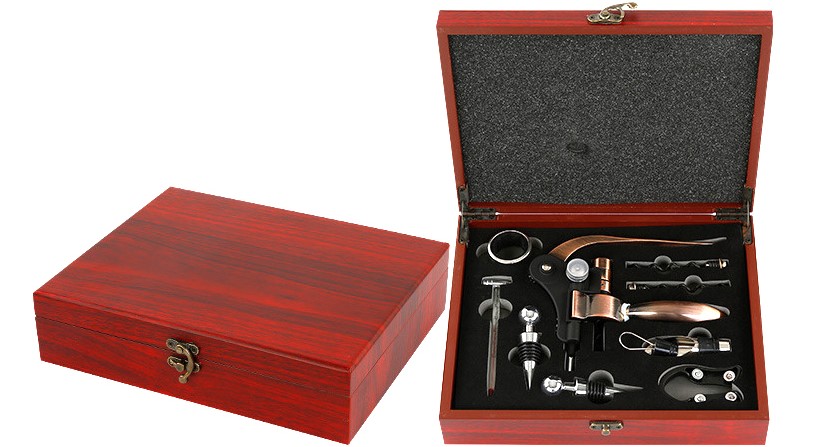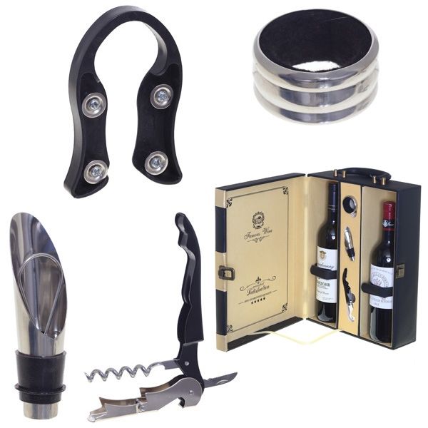 Une belle caisse en bois avec 9 articles convient comme cadeau pour les vrais sommeliers. Ensemble complet : tire-bouchon semi-automatique, 2 buses, 2 bouchons universels, attrape-gouttes, collier, couteau, thermomètre. Matière : acier, plastique, silicone. Dans le cas, chaque accessoire est dans sa propre cellule, cela vous permet d'utiliser chaque accessoire aussi commodément que possible. Prix moyen : 2841 roubles.
