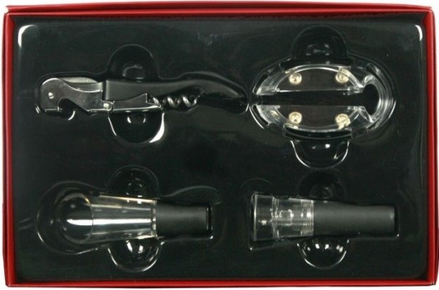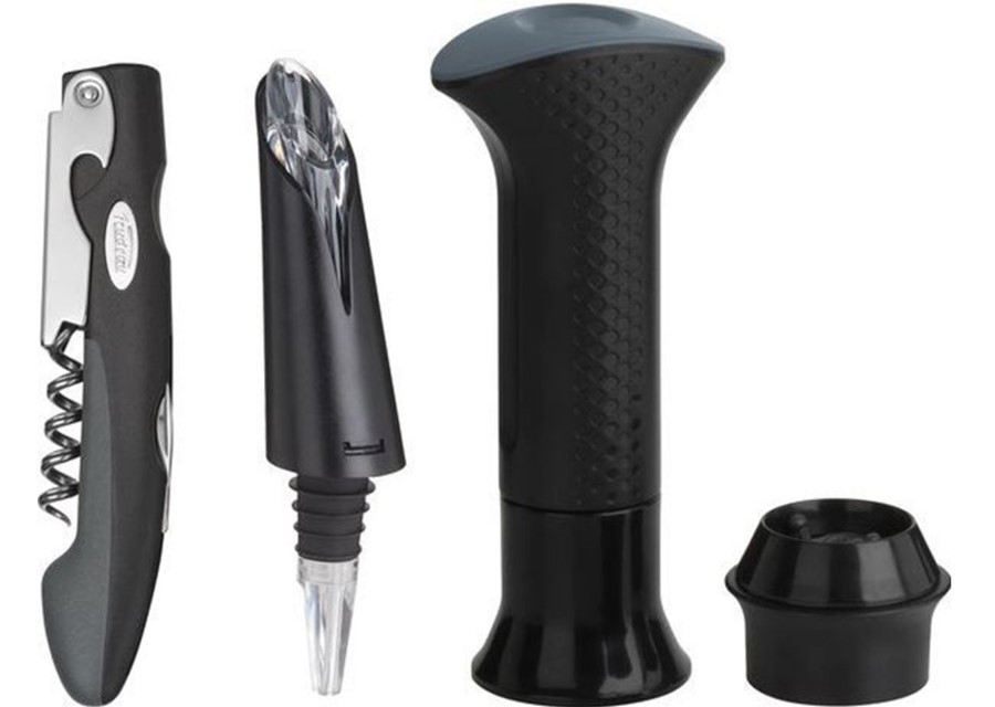 Ensemble de 4 pièces de haute qualité. Les matériaux nocifs et dangereux ne sont pas utilisés dans la production. Un tire-bouchon professionnel avec une poignée antidérapante peut facilement manipuler tout type de bouchon, y compris les synthétiques. L'aérateur améliore le goût du vin, permet à l'arôme de s'ouvrir complètement. La pompe à vide et le bouchon permettent de conserver toutes les propriétés d'une bouteille ouverte pendant 7 jours. Un récipient ouvert peut être stocké même en position horizontale, la haute qualité du vide assure une parfaite étanchéité. Coût : 10150 roubles.