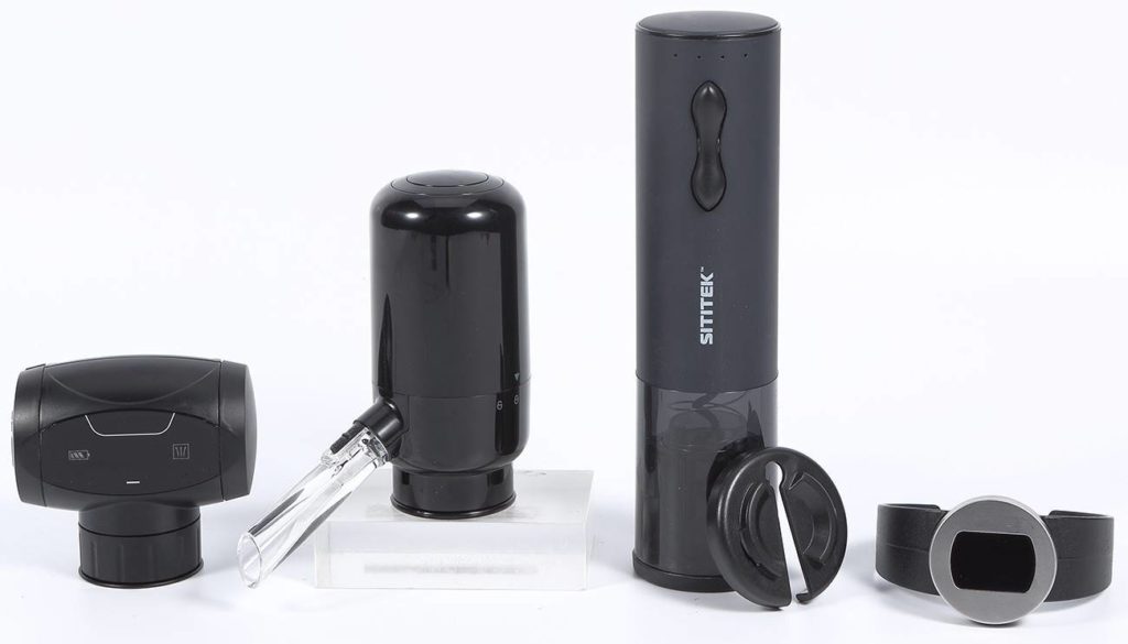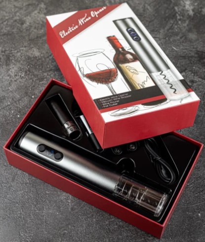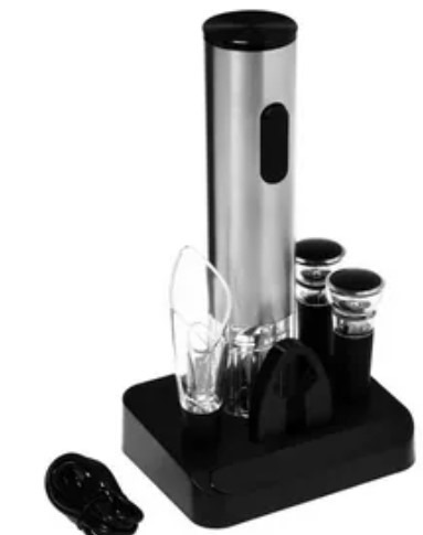 Mister Box propose des accessoires modernes et élégants à un prix relativement bas. Le tire-bouchon est électrique, l'alimentation est réalisée à partir de 4 piles rechargeables au doigt. Nombre d'appareils : 8 pièces. Matériau : silicone de qualité alimentaire, alliage d'aluminium, plastique, acier. Dimensions : 27,8 × 17,9x6,5 cm Prix : 3506 roubles.
