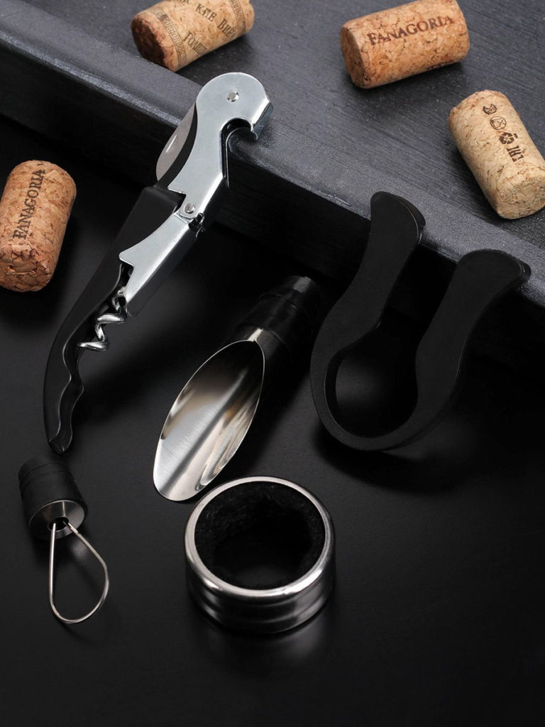 Le forfait de base comprend le plus souvent un tire-bouchon, un couteau pour enlever une couche de papier d'aluminium, un bouchon de liège, un attrape-gouttes. Des accessoires supplémentaires peuvent être disponibles selon les options.