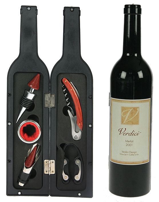 Les produits de cette catégorie dans cette société sont présentés sous la forme de bouteilles de vin dans de beaux emballages lumineux. Les modèles sont disponibles en 3 versions. Contenu : tire-bouchon, anneau, distributeur, coupe-capsule, bouchon pour stockage longue durée. Dimensions du colis : 7,5 x 7,5 x 32,5 cm Pays d'origine : Chine. Prix : 1245 roubles.