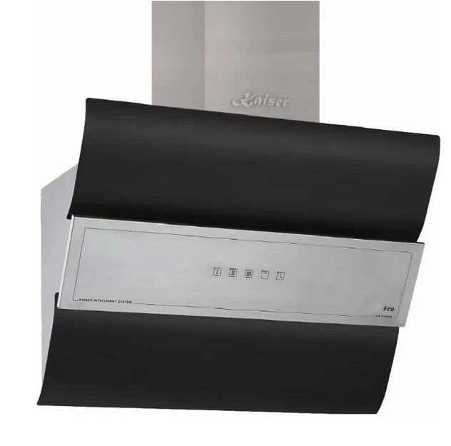 Équipement de type foyer avec un système de commande à bouton-poussoir situé sur le côté droit du corps. La forme du panneau est inclinée, en acier inoxydable et en verre durable. Il y a une minuterie pour l'arrêt automatique, un double filtre (graisse + charbon), une aspiration d'air autour du périmètre. L'éclairage est halogène, situé sur les côtés, en dessous dans des lampes rondes.