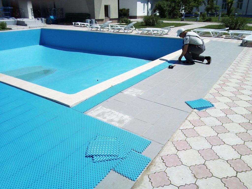 Les produits modulaires sont faciles à assembler. Les éléments individuels sont facilement attachés les uns aux autres, grâce à quoi ils peuvent être posés sur une surface de n'importe quelle taille et forme. De plus, en cas de violation de l'intégrité d'une telle structure, il est facile de remplacer ses pièces endommagées sans modifier la finition dans son ensemble. Ils adhèrent bien à la surface du fond de la piscine, de sorte que les produits modulaires n'ont pas besoin d'être collés à la surface du sol.