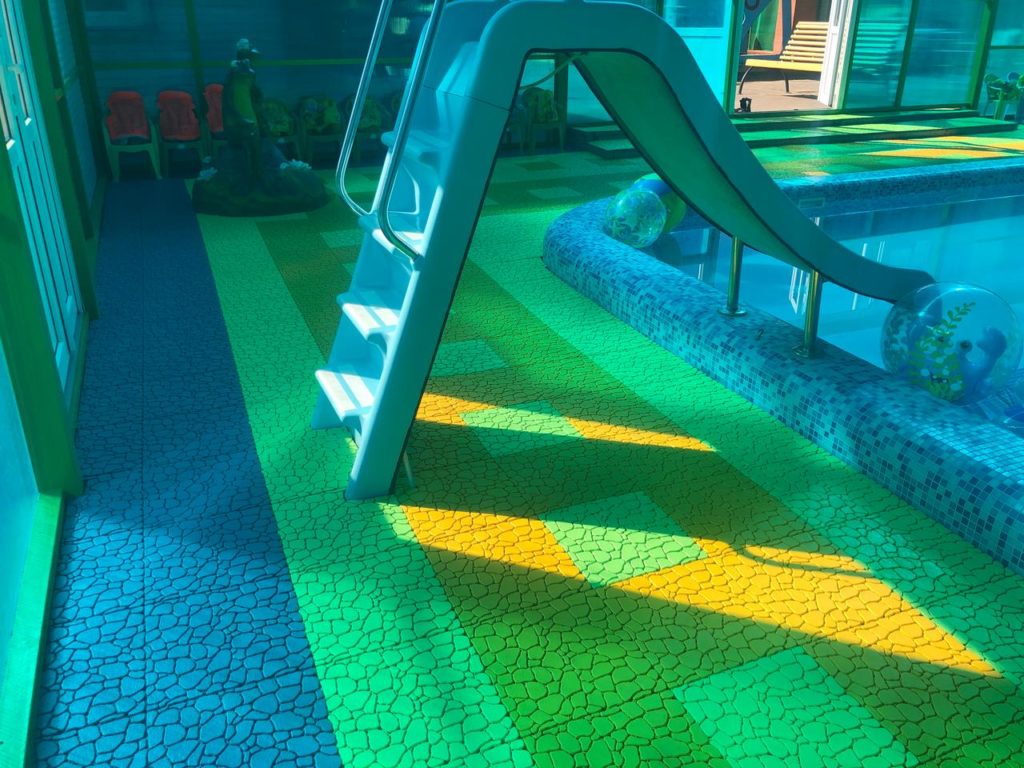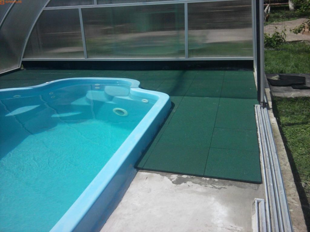 Ces dalles souples de sécurité sont en caoutchouc granulé.Le revêtement de sol est conçu spécifiquement pour une utilisation dans les zones humides, finissant la zone autour de l'eau libre. De plus, il peut être utilisé pour la finition des zones autour des piscines intérieures. Absorbe bien l'eau, confortable pour le mouvement en raison de sa douceur et de ses propriétés d'absorption des chocs. Il résiste aux moisissures et aux champignons, ne provoque pas d'allergies. "Rubblex Pool" a une résistance chimique aux alcalis, à l'essence et aux huiles minérales. Le coût moyen est de - 1 700 roubles.