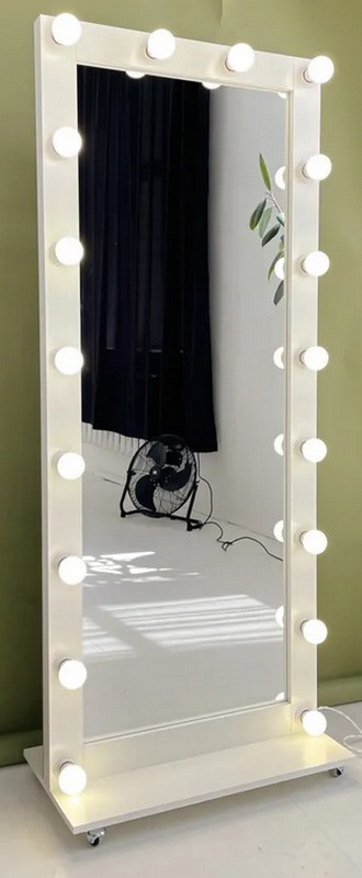 Cet article est livré avec un cadre blanc. Le support est amovible, vous pouvez utiliser l'échantillon sans support et même l'accrocher au mur (2 boucles supplémentaires sont incluses). Il y a un beau cordon rétro avec une fiche de 2 mètres de long. Des interrupteurs élégants sur le corps du cadre soulignent son design et sa haute qualité. Il existe trois modes d'éclairage (18 lampes, 10 lampes, 8 lampes). Grâce à la faible largeur du cadre - 8 cm, il a l'air élégant et peu encombrant. L'épaisseur du cadre est de 5 cm.La taille de la feuille de miroir est de 159x57 cm.La taille globale est de 182x73 cm.Le prix recommandé pour les chaînes de vente au détail est de 9 400 roubles.