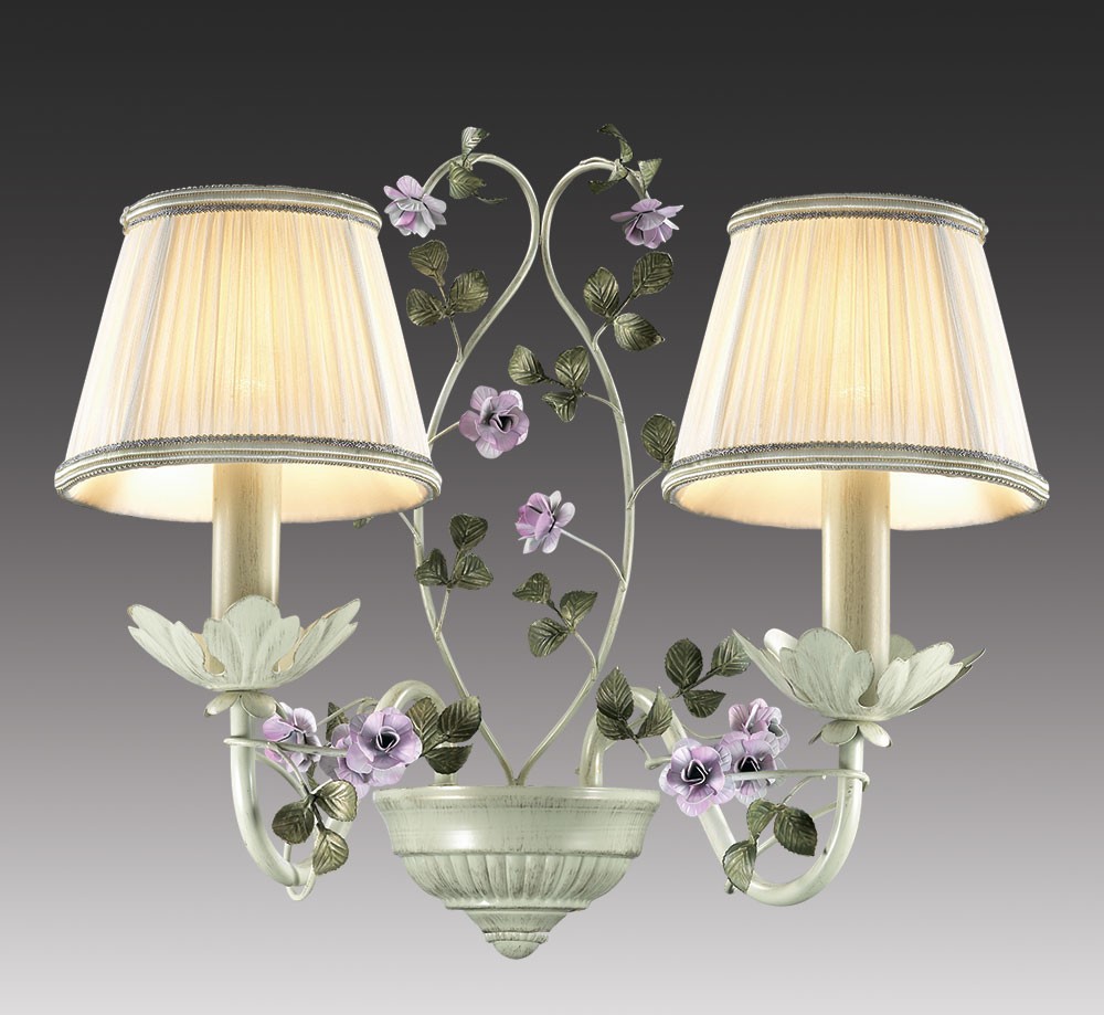 Le modèle est idéal pour les natures romantiques.Le plus souvent utilisé dans le style provençal. Deux petits abat-jour décorés d'imprimés floraux rendent la pièce confortable. Deux lampes à incandescence sont utilisées pour l'éclairage, il est donc recommandé d'utiliser plusieurs de ces appliques pour les grandes pièces.