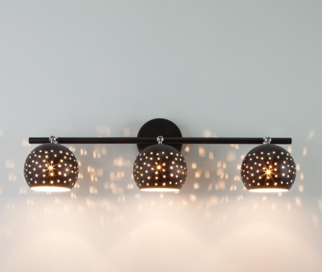 La conception a la forme de trois nuances qui sont fixées au mur. Les plafonds ont de petits trous, de sorte que la lumière est doucement dispersée dans la pièce. Lors de l'achat d'une applique, les lampes sont incluses dans l'emballage. L'abat-jour et la plaque de montage sont en métal. La lampe murale brille de mille feux, elle peut donc être utilisée comme éclairage supplémentaire au-dessus du lit ou de la zone de travail.