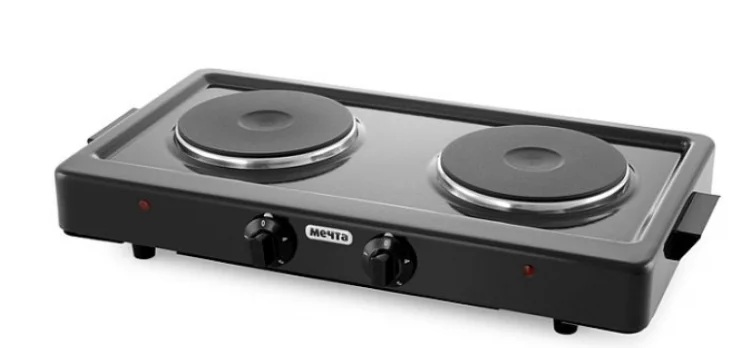 Plateau de table noir avec interrupteurs rotatifs. Le diamètre des éléments de cuisson est le même, dont le milieu est de type concave. L'équipement est équipé de petits pieds cylindriques (caoutchoutés). Il y a des poignées sur les côtés du cadre.
