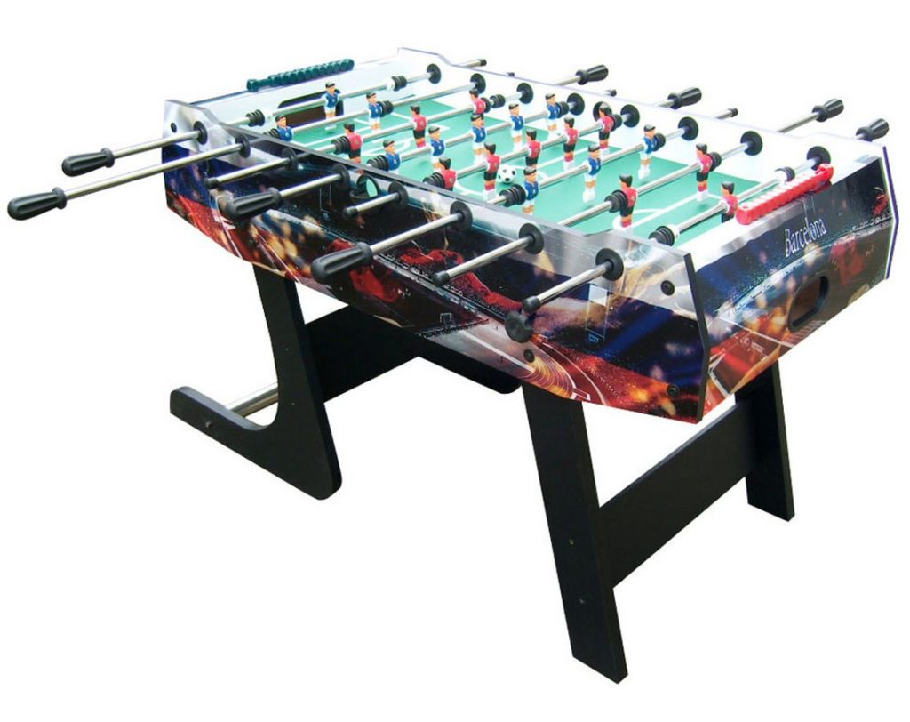 Table de baby-foot pliable avec dessus de table. Le jeu a un poids de 20 kg et convient à tous les âges. La base en bois donne de la force au produit, ainsi le jeu durera longtemps quelle que soit l'intensité d'utilisation. Une fois plié, le produit prend peu de place et peut être rangé contre le mur. Souvent utilisé lors d'événements à domicile comme divertissement supplémentaire.