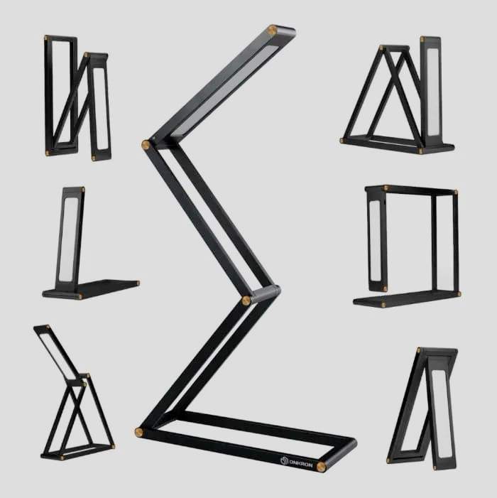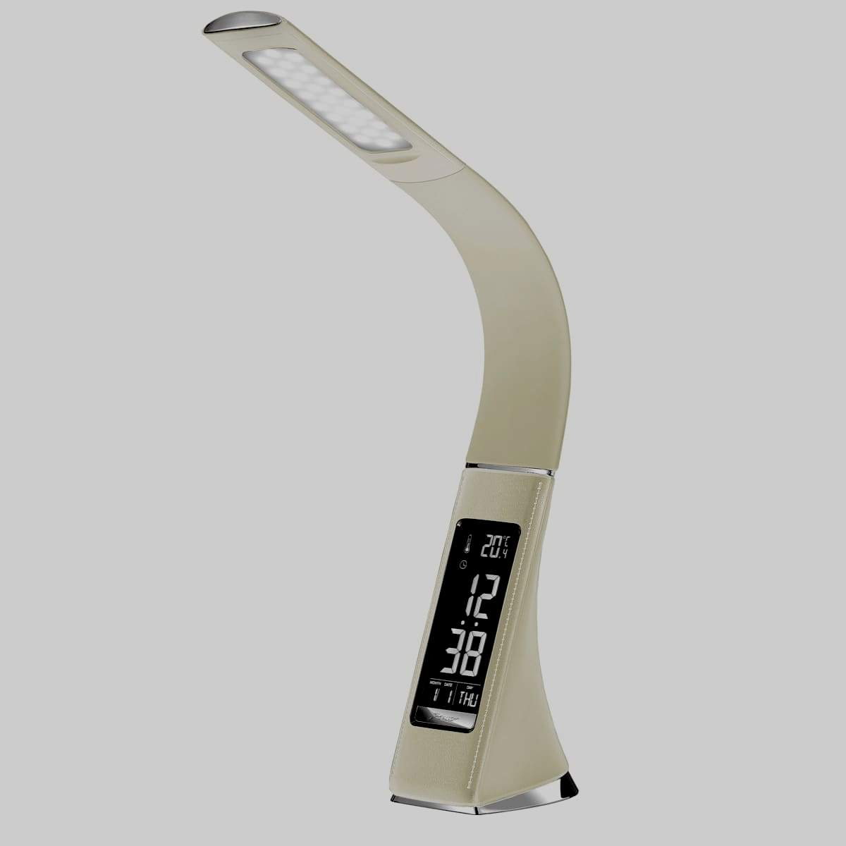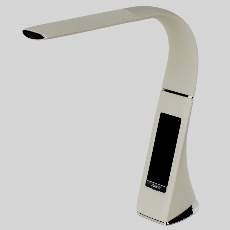 Le luminaire est équipé d'un écran tactile. Capable de travailler 30 000 heures. Malgré le support fin, le produit tient fermement sur la table. Il ne prend pratiquement pas d'espace libre. Il y a un écran et une horloge intégrée qui sont visibles dans l'obscurité totale. Ils indiquent également la température de l'air dans la pièce et le calendrier. Il y a un réveil. Dans la fabrication du boîtier, du plastique caoutchouté est utilisé. La jambe se plie bien dans différentes directions. Très confortable pour les yeux. Disponible en marron, blanc et noir.