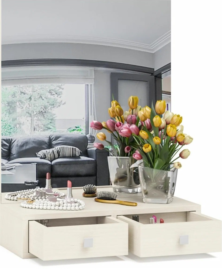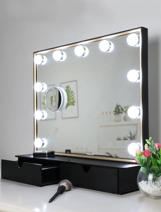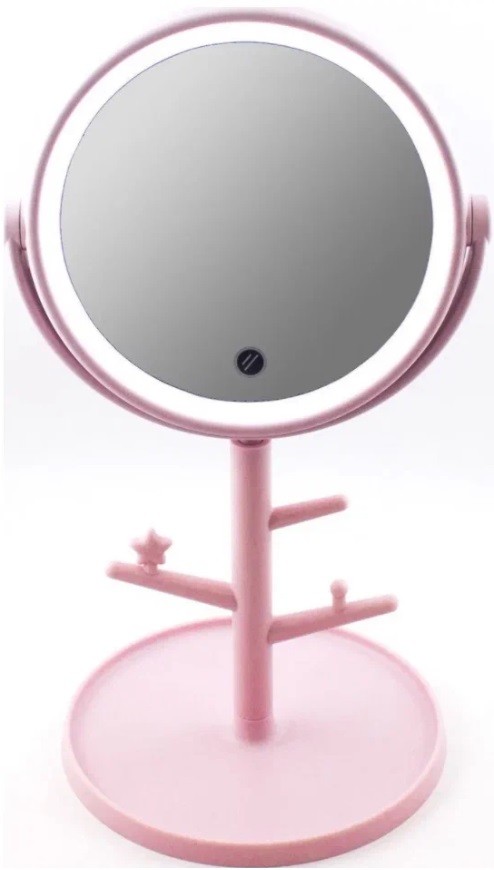 Conception de bureau légèrement plus élaborée. Le corps vous permet de changer l'inclinaison. De plus, la conception met l'accent sur le stockage des bijoux. Des "branches" particulières et une plate-forme avec un côté ne permettent pas aux accessoires de glisser et de rouler. Le bouton ajuste le degré de luminosité de la lumière, en choisissant parmi trois niveaux disponibles.