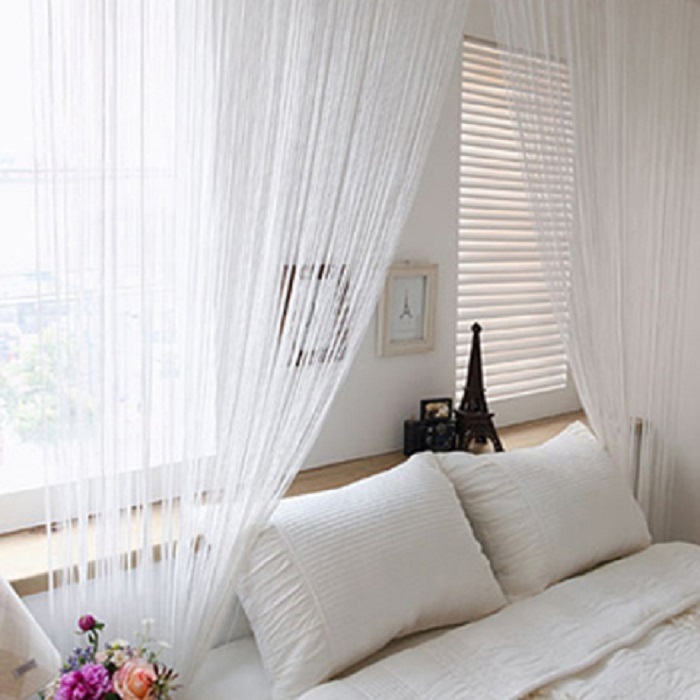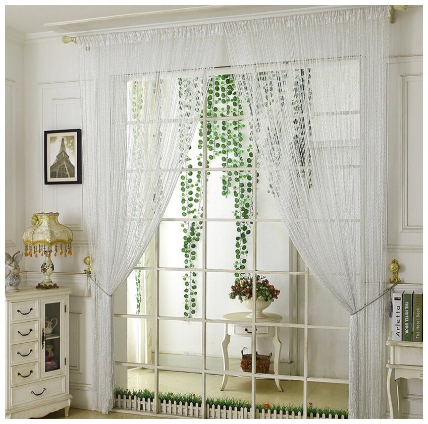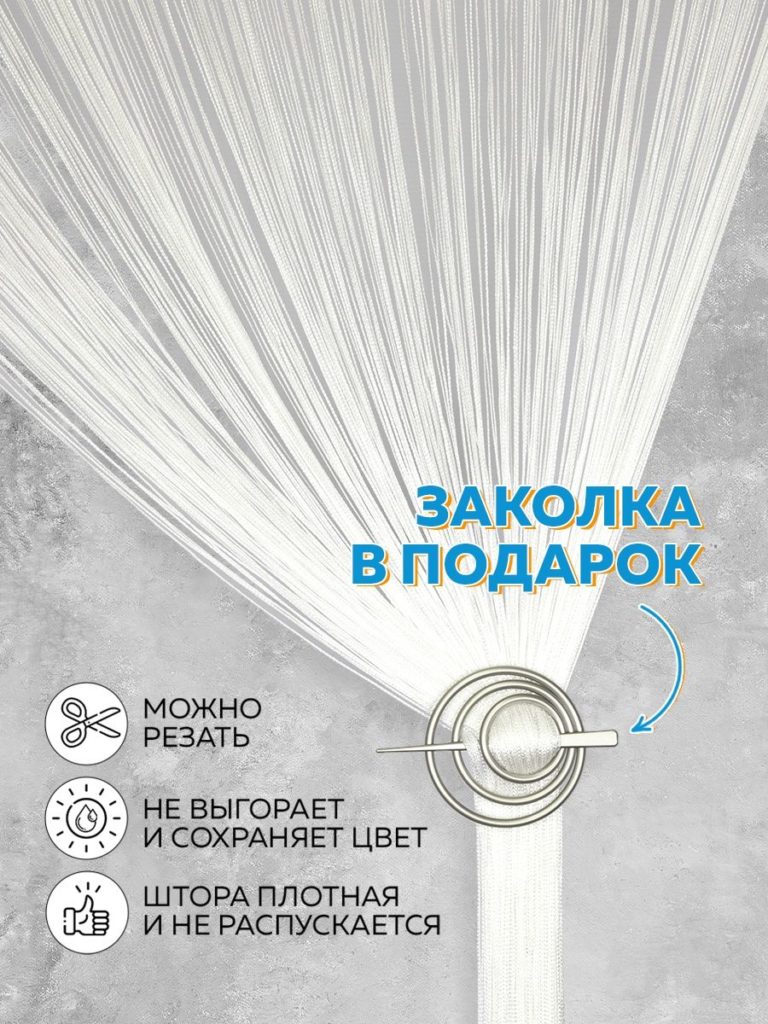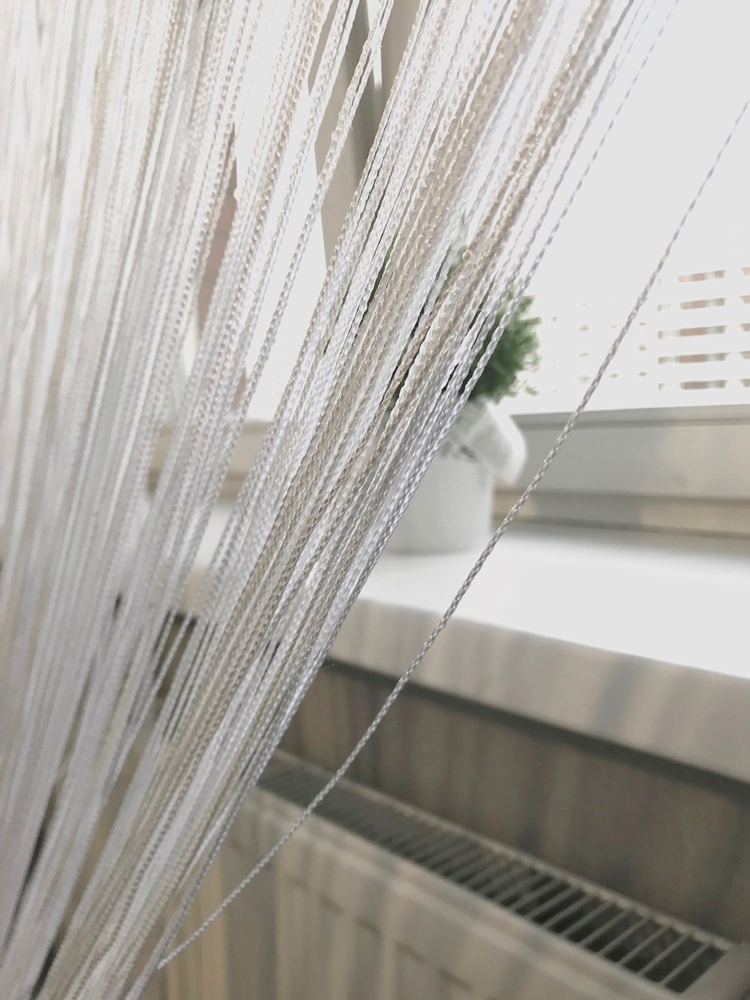 Les rideaux en filament ne nécessitent pas de repassage. Avant la première utilisation, il est recommandé de laver à la main (après avoir préalablement fixé les fils à 2-3 endroits), puis de l'accrocher sur une corniche et de le laisser pendre 1-2 jours. Après cela, si nécessaire, coupez à la longueur souhaitée. Prix : 958 roubles.