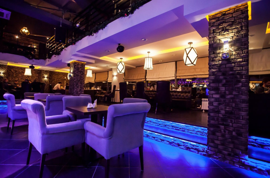 Une approche professionnelle a également été adoptée pour le design intérieur du bar - l'intérieur a été développé par un designer russe de premier plan - les zones douces, pouvant accueillir jusqu'à 10 personnes, sont équipées de canapés confortables et confortables, le bar est en noir brillant et le la salle principale est équipée d'une scène professionnelle.