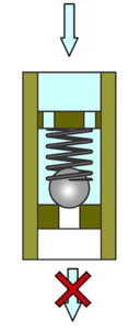 Le flux provenant du manchon abaisse la bille, ouvrant l'espace pour un flux vers l'avant. Lorsque la pression chute, la bille est repoussée, fermant l'écart avec blocage du débit.