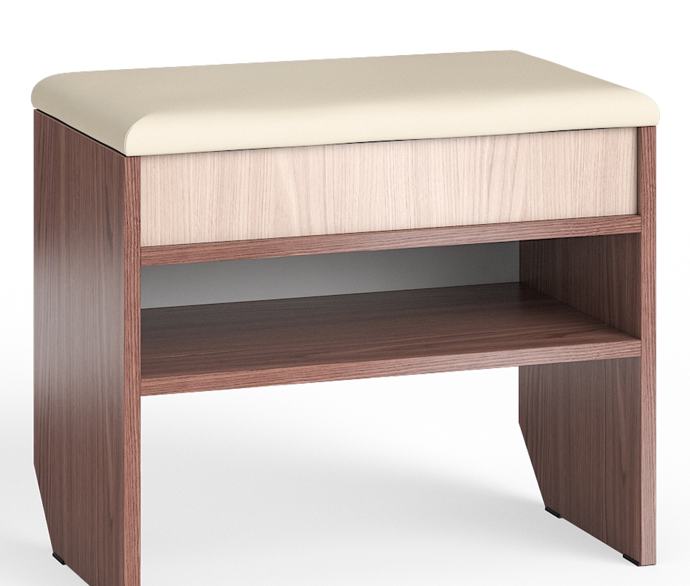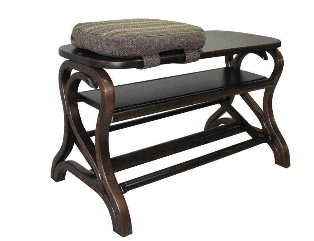 Le modèle est fait de bois, de métal et de cuir écologique. Le design est petit et prévu pour plusieurs paires de chaussures. La partie supérieure est équipée d'un pouf confortable. Les pieds sont équipés de coussinets spéciaux pour que le sol ne se détériore pas. Le modèle peut être facilement déplacé dans la pièce, grâce à sa taille compacte, le produit peut être installé dans un coin.