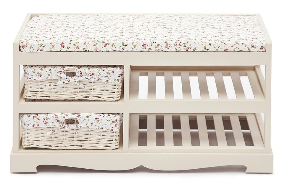 Pour les utilisateurs romantiques, ce modèle de style provençal est idéal. La structure est divisée en deux sections. L'un contient des boîtes. De l'autre côté, il y a des étagères pour les chaussures. Les empiècements textiles attirent l'attention. Par conséquent, le porte-chaussures ne passera pas inaperçu auprès des invités. Sur le dessus de la structure se trouve un coussin moelleux qui, si nécessaire, peut être retiré et nettoyé. Le cadre est en bois, il est donc stable et peut supporter de lourdes charges. Même avec une utilisation fréquente, le produit durera longtemps sans perdre son apparence et ses caractéristiques.