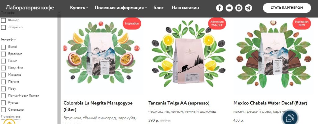 L'entreprise maintient un compte Instagram, où elle publie régulièrement des recettes intéressantes, des émissions en direct et des nouvelles du monde de l'industrie du café. Les matières premières d'Asie, d'Afrique, d'Amérique latine et d'Amérique centrale sont livrées dans des sacs de jute, torréfiés à l'italienne sur des torréfacteurs de haute technologie des meilleures marques du monde.Le résultat est du café pour la maison, le bureau, les cafés, les machines à café. Le site est agencé de manière pratique, les rubriques sont cliquables, la navigation est simple. Lors de l'entrée dans le catalogue, un message apparaît concernant le temps restant avant le début de la torréfaction de la commande proposée et la date de livraison. Des filtres pratiques vous permettent de sélectionner un produit par densité, acidité, type de brassage, en face de chaque lot se trouve une note moyenne des avis des clients sur une échelle de cinq points. Vous pouvez choisir des nouveautés, des lots exclusifs, des produits en promotion à prix réduit. Un coffret de lots uniques est présenté au montant de trois pièces de 85 g chacune issues des championnats du monde.