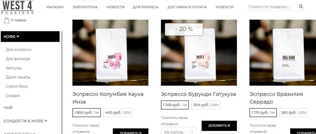 Il convient de noter la possibilité de commander du café non seulement en grains, mais également moulu, tout en choisissant le degré de mouture lors de la commande est pratique. Déjà sur le site, des options sont proposées en fonction de la façon dont la boisson sera préparée à l'avenir : dans une presse française, une cafetière goutte à goutte, à l'aide d'un Chemex, d'un Aeropress, d'un pourover, de Turcs ou en infusant dans une tasse.