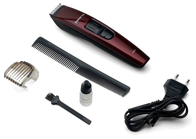 L'appareil se distingue par un boîtier élégant et compact en plastique brillant bordeaux agréable. Le but initial du gadget est la formation d'une barbe ou d'une moustache, car il est léger, devenant une excellente option pour un amateur de voyage. Le matériau de la partie coupante est en acier inoxydable auto-affûtant, ce qui lui permet de rester affûté pendant longtemps. L'huile de lubrification est incluse avec la machine, ainsi qu'une brosse spéciale pour le nettoyage de l'appareil.