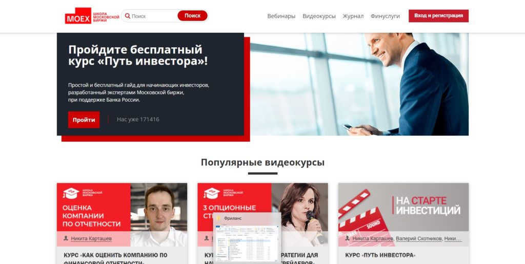 La bourse la plus populaire de la Fédération de Russie a développé sa propre formation gratuite pour éduquer les investisseurs. Les experts fournissent non seulement des connaissances de base, mais parlent également des erreurs typiques et des erreurs de calcul des débutants. Les connaissances acquises peuvent être immédiatement testées dans la pratique sous la direction de mentors expérimentés.