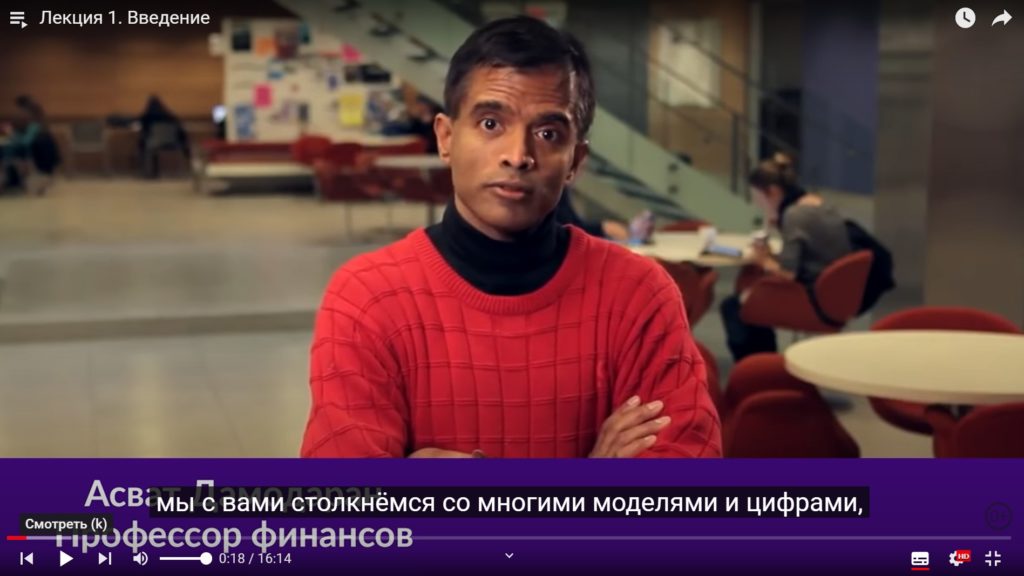 Les conférences enregistrées par le professeur Aswat Damodaran et publiées sur l'hébergement vidéo YouTube le plus populaire intéresseront à la fois les débutants et les professionnels. Au cours de 25 conférences, l'intervenant dévoilera les termes et concepts de base, expliquera sous une forme accessible les bases du travail en bourse, analysera des exemples précis d'opérations et donnera de nombreuses recommandations.