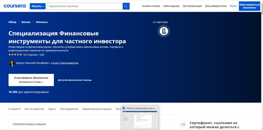 Ce programme a été créé par les enseignants les plus expérimentés de l'École supérieure d'économie de l'Université nationale de recherche. Les connaissances sur les particularités du travail en bourse et les principes de création d'un portefeuille efficace sont présentées sous une forme accessible. Il existe une possibilité d'éducation payante et gratuite. Le programme est conçu pour 7 mois.
