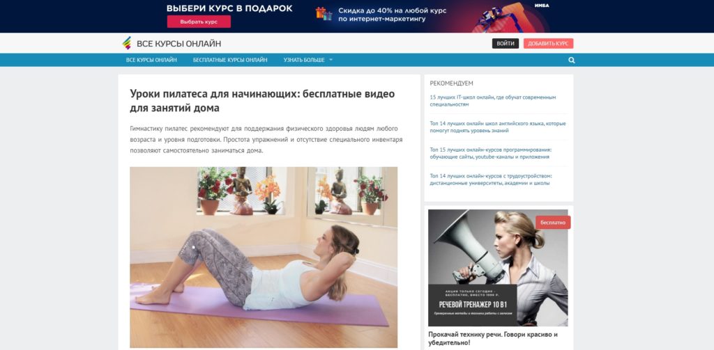 Le site populaire All Courses Online propose une vaste sélection de différentes vidéos de you-tube. Cette compilation Pilates est recommandée pour les débutants, car elle n'a pas une grande charge de puissance, ce qui ne fera qu'endommager le corps sans y être préparé. Les exercices sont exécutés par des entraîneurs et des instructeurs célèbres, expliquant comment les exécuter correctement.