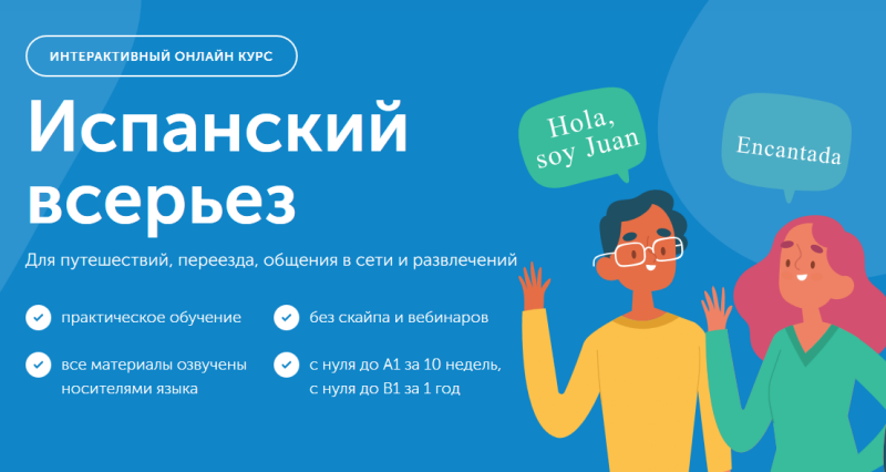Le cours complet se compose de plusieurs blocs et dure 4 mois. Pendant ce temps, même les débutants pourront maîtriser les niveaux A1 et A2. La littérature méthodologique (manuels, revues, manuels) en espagnol est fournie gratuitement. Les devoirs peuvent être complétés en deux versions, soit l'élève complète tous les tests par lui-même, soit vous pouvez payer en plus des consultations individuelles avec un enseignant qui vérifiera chaque devoir et signalera les erreurs. Coût : 10 000 roubles.