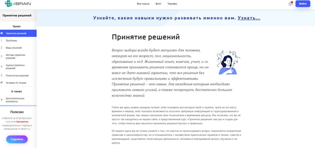 La célèbre plateforme 4brain propose un cours visant à apprendre la compétence de la prise de décision. Le matériel comprend une leçon d'introduction, 5 blocs de formation et un examen rémunéré sur les informations étudiées. De plus, la plateforme de développement du cerveau propose une liste de matériel d'auto-apprentissage supplémentaire qui augmentera les connaissances sur ce sujet.