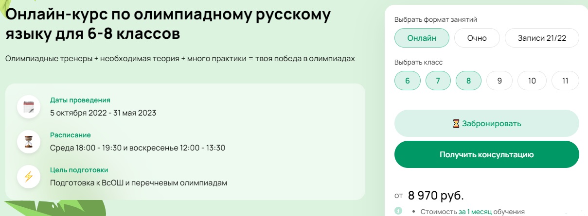 Sur la plateforme, vous pouvez acheter des cours de préparation aux Olympiades pour les grades 6-8 et 9-11. Enseignant de la 6e à la 8e année - Shirokov Ivan Alekseevich. Il est entraîneur des Olympiades, étudie à la Faculté des sciences humaines de l'École supérieure d'économie de l'Université nationale de recherche, lauréat du "Standard le plus élevé". Enseignante de la 9e à la 11e année - Patrikeeva Ksenia Alexandrovna. Étudie à la Faculté de philologie de l'Université d'État de Moscou. Lomonossov, lauréat de l'École supérieure d'éducation en langue russe.