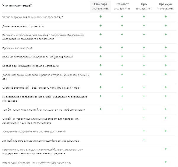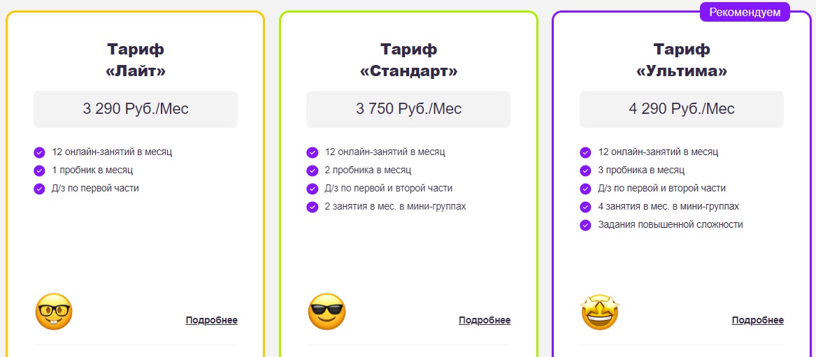 Le coût du tarif standard est de 3600 roubles. par mois, tandis que vous aurez accès à des cours dans 3-4 matières. Il existe également un tarif PRO pour 4600 roubles. par mois, il comprend en outre des tâches de complexité accrue, plus de sondes et des tests oraux.