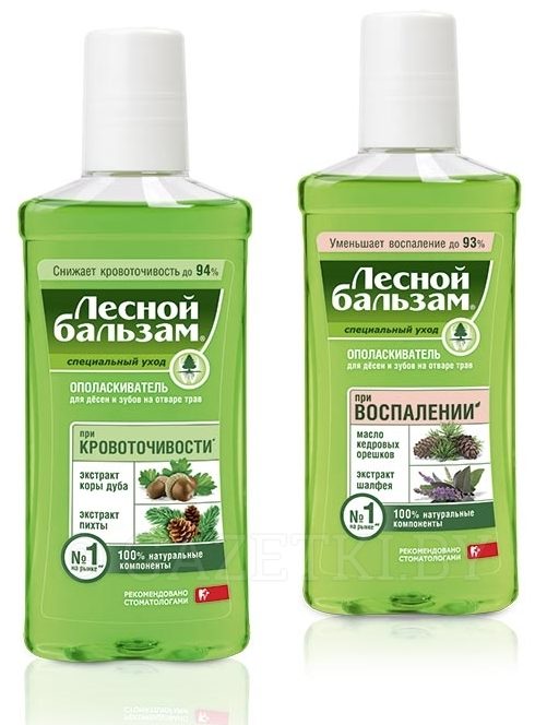 Bain de bouche de production nationale. Inclus dans le complexe pour les soins bucco-dentaires, produit sous la marque "Forest Balsam".Le liquide de rinçage lui-même est utilisé à la fois à titre préventif et pour résoudre des problèmes dentaires spécifiques : haleine repoussante, présence de plaies sur les gencives et de saignements, ralentissement de la formation de tartre, etc. Plusieurs types de liquide de rinçage sont produits, qui se différencient par ingrédients actifs, dont les principaux sont des extraits d'herbes médicinales. Mais la majeure partie de la ligne vise à résoudre les problèmes liés à l'inflammation des gencives. Plus de détails sur chaque type ci-dessous.