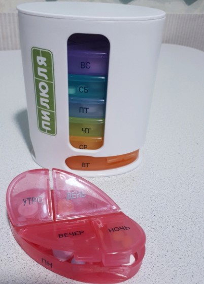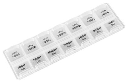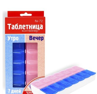 Produit populaire en provenance de Chine à petit prix, il est fabriqué en plastique souple. Se compose de deux blocs de sept départements pour les médicaments du matin et du soir. Modèles Plus dans des couvercles pratiques avec des clips serrés qui vous permettent de placer le contenu hermétiquement. Excellente option pour les déplacements. Il n'y a pas de marquage, ce qui n'est pas toujours pratique, sinon il n'y a pas d'inconvénients.