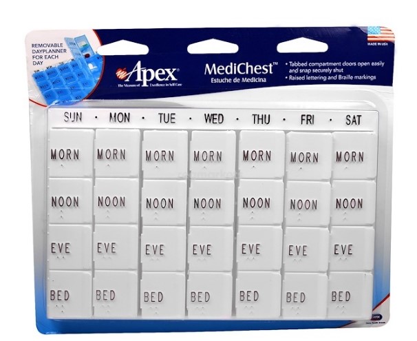 Le produit de fabrication polonaise comprend 28 compartiments : un récipient pratique pour afficher les médicaments sept jours sur sept, quatre doses par jour. Un marquage pratique comprend non seulement les jours de la semaine, mais également l'heure exacte d'admission. Fabriqué en plastique européen de haute qualité, équipé de couvercles transparents confortables avec des loquets solides.