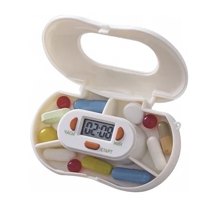 Modèle facile à utiliser pour prendre trois fois des pilules avec une minuterie. L'heure exacte est réglée lorsqu'un signal sonore fort est émis, grâce auquel même une personne ayant une mauvaise mémoire n'oubliera pas de prendre le médicament à temps. Les fermoirs sont faciles et fermement fixés, ce qui empêche le contenu de se renverser.