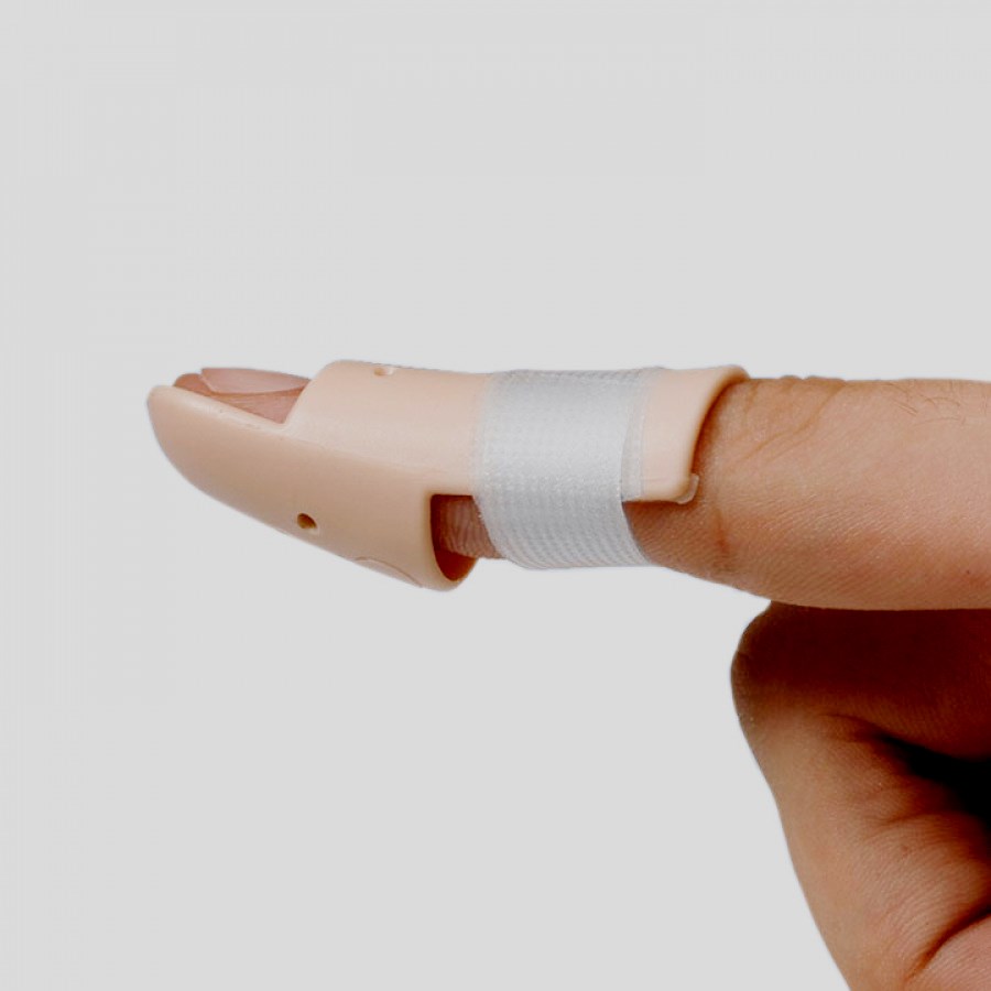 Le produit est en thermoplastique. Il se compose de deux parties : la partie inférieure recouvre la zone distale et atteint l'extrémité du doigt, la partie supérieure est reliée à la partie supérieure, tandis que l'ongle est complètement ouvert. Il n'est pas possible de plier un doigt. Le produit peut être adapté aux caractéristiques individuelles du patient. Pour ce faire, il suffit d'utiliser l'air chaud sortant du sèche-cheveux. Il n'y a pas de latex, ce qui évite la survenue de réactions allergiques. Il est prescrit pour les blessures et l'avulsion de l'extenseur Indis Proprius.