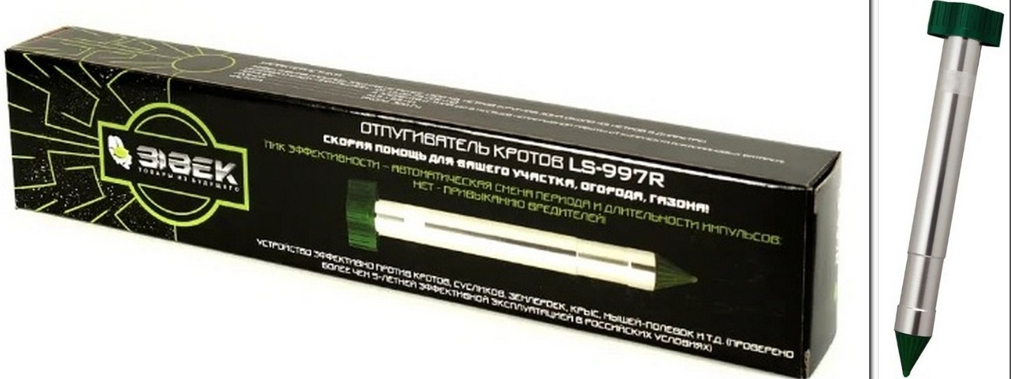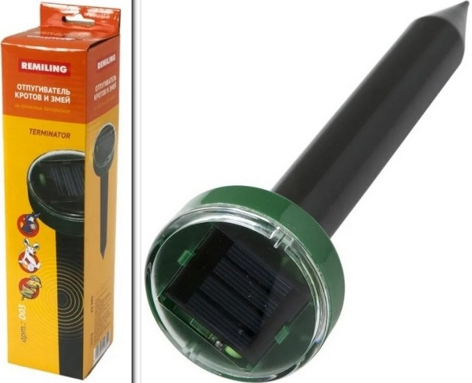Un «clou» de petite taille, en hauteur, sur le capuchon duquel se trouve une batterie solaire. Affecte une profondeur allant jusqu'à 20 centimètres. La tige est en aluminium, elle ne rouillera donc pas si elle est mouillée. Pour obtenir un résultat rapide, vous pouvez utiliser plusieurs de ces appareils. Le dispositif est doté de taux élevés de fréquence de fonctionnement et de couverture du territoire.