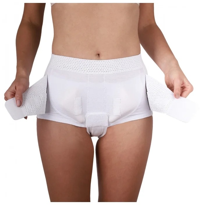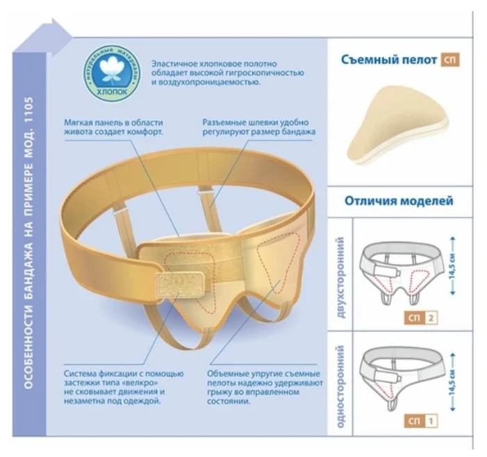 C'est une large interception avec des cuissardes réglables, recouvrant complètement la porte inguinale. Le design est fait de tissus écologiques, agréables au toucher. Ils sont hypoallergéniques et favorisent une bonne circulation de l'air. Principalement utilisé pour empêcher la croissance ou le pincement de la saillie. S'attache au corps avec des sangles.